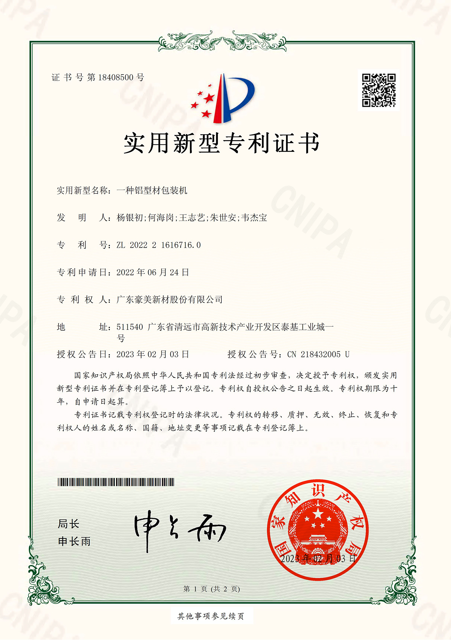 ZL 2022 3 0671562.4 鋁合金窗框型材(光企和勾企執(zhí)手2022)